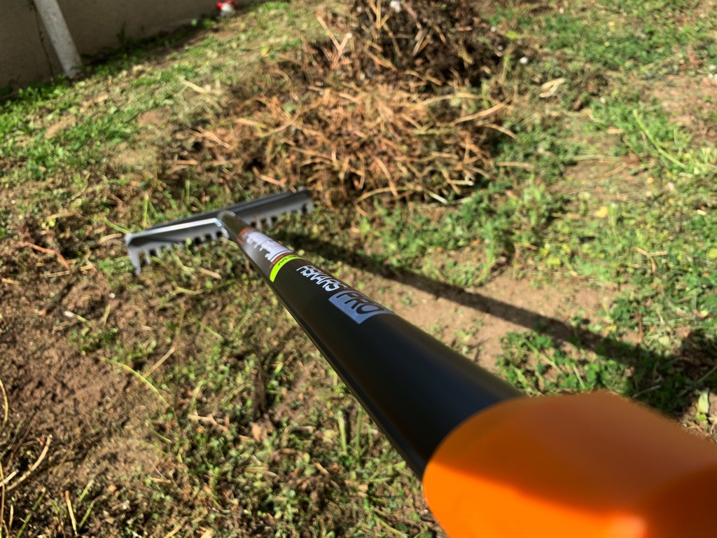 The Fiskars Pro rake tears through thatch and weeds like a honey badger.