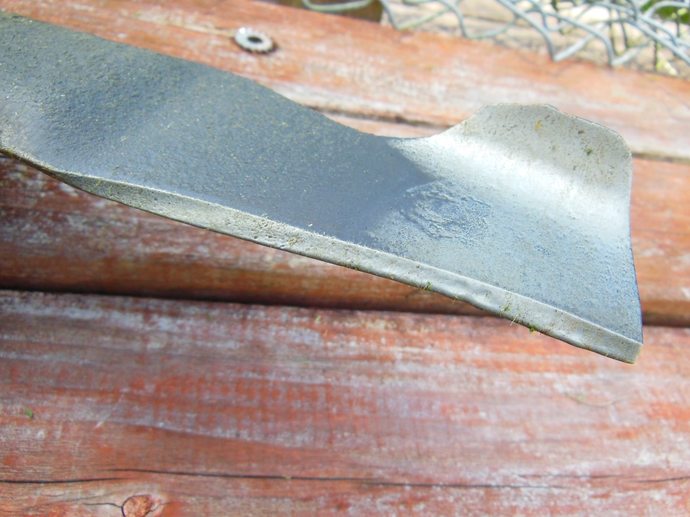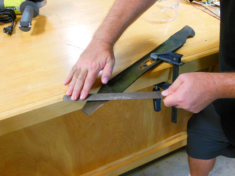 Whether you use a file or a grinder, start each pass or stroke closest to the center of the blade and work towards the end. This lowers the likelihood of catching on the corners (or rounding them over). The same goes for mulching blades – which usually have a hump in the middle of the cutting edge – but you’ll have more contours to navigate.