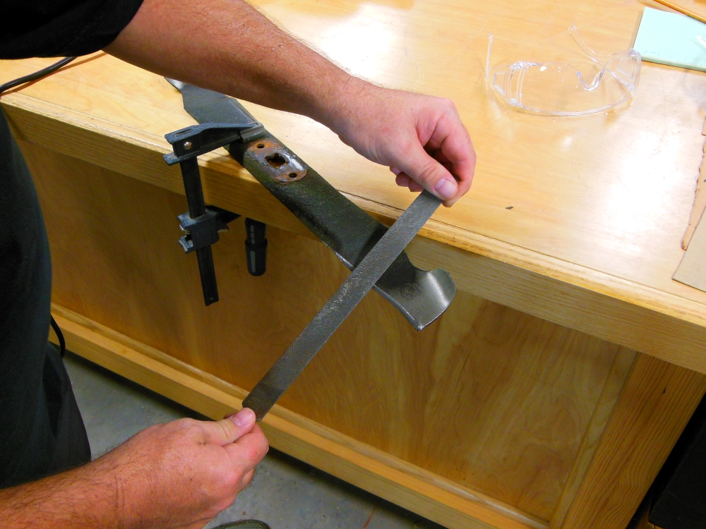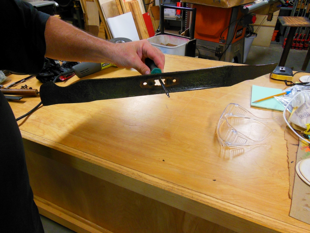 Deburring. I’m pushing the file away from myself and working towards the end of the blade (right to left). Watch that sharp edge!