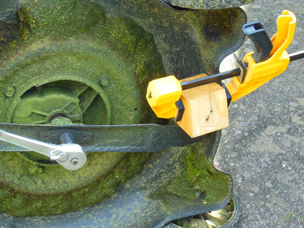 A block of wood clamped to the housing holds the blade still while you loosen (or tighten) the mounting bolt.