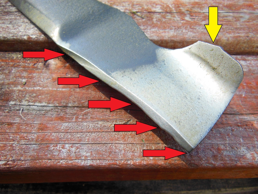This is a standard low lift mower blade. The red arrows indicate the beveled cutting edge. The yellow arrow points to the wing, which creates suction that lifts the grass for better cutting and waste ejection.