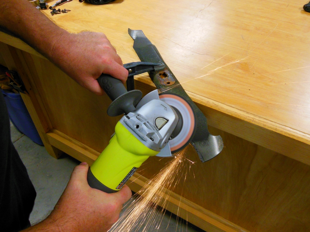 Some people sharpen lawn mower blades with a file or bench grinder, but it’s quicker and easier to use an angle grinder. Grind the bevel, not the flat, bottom surface of the blade. Do your best to preserve the bevel angle (usually around 45°) and don’t allow the cutting edge to get too hot.