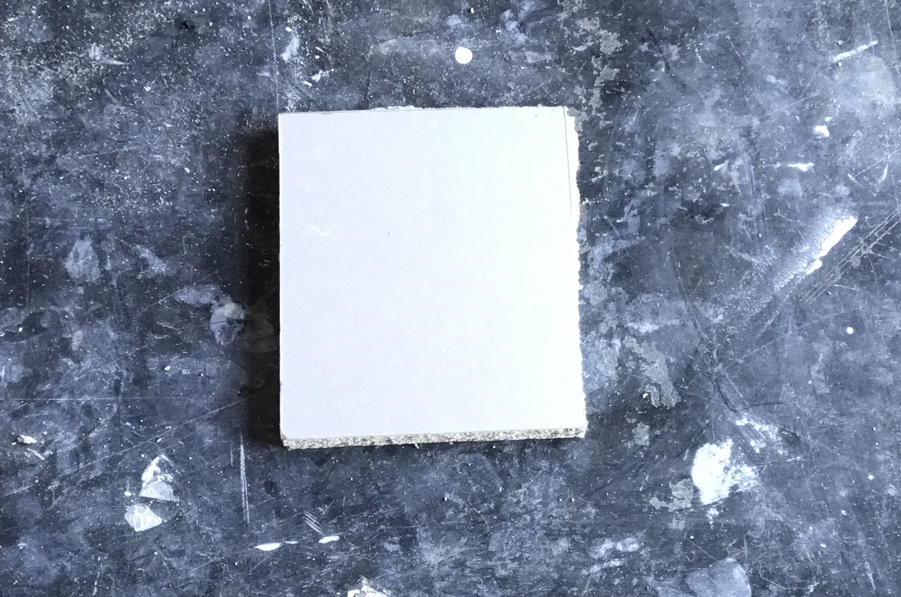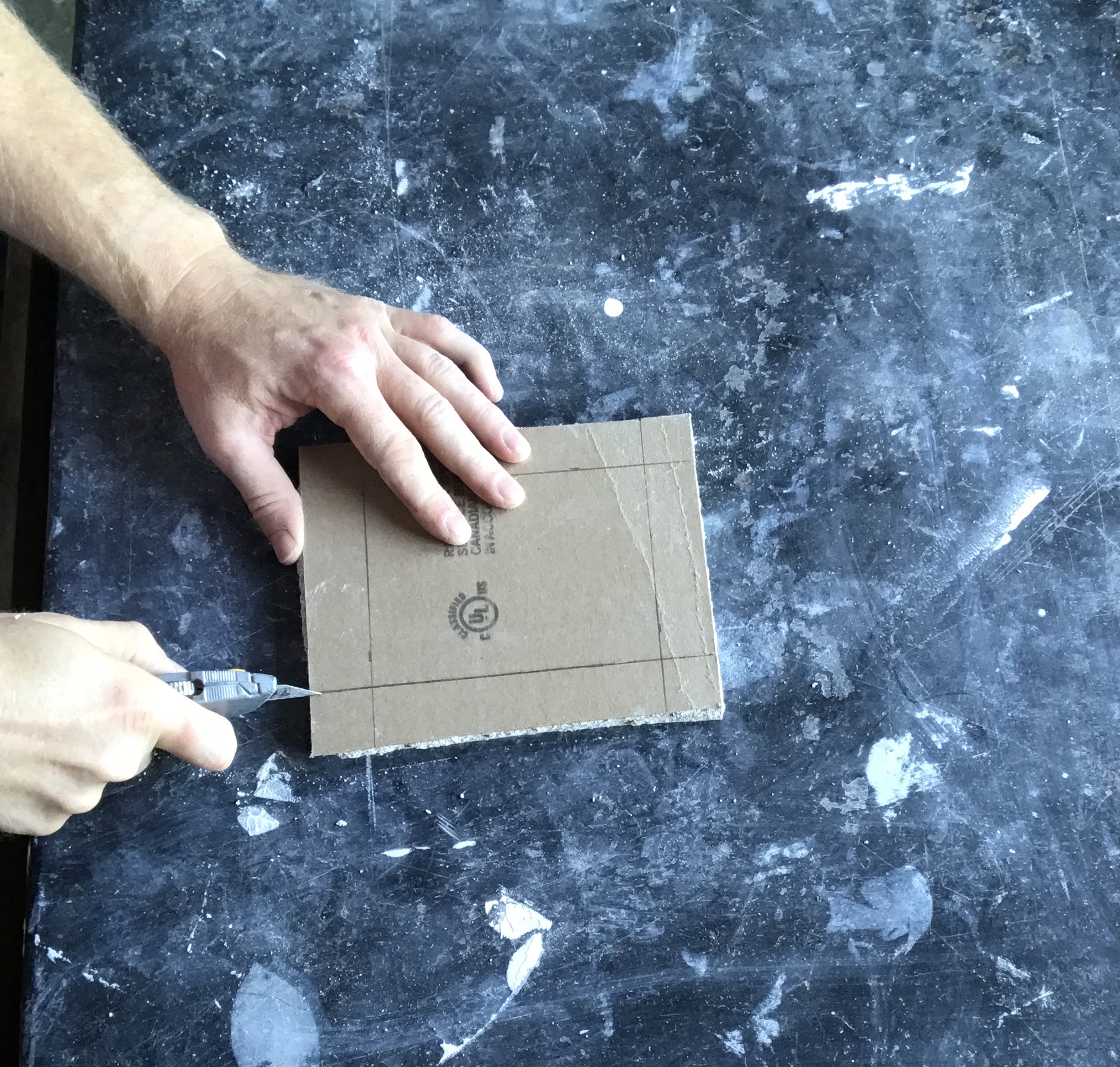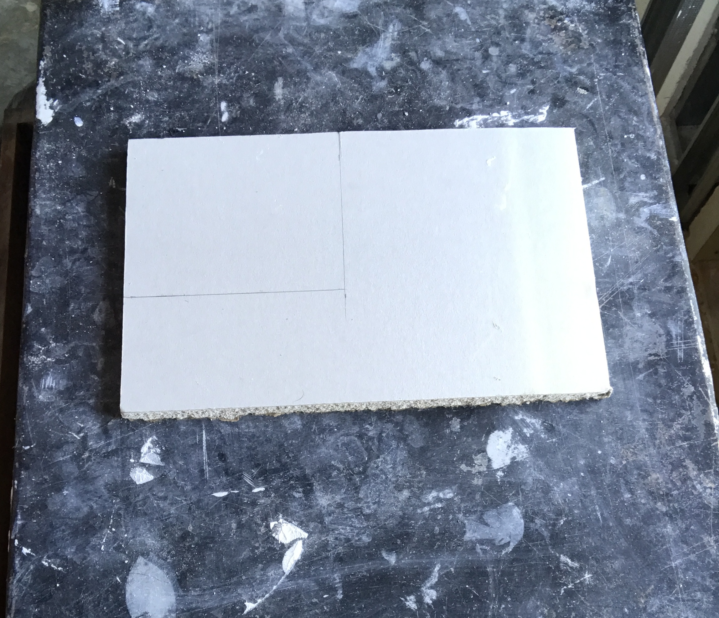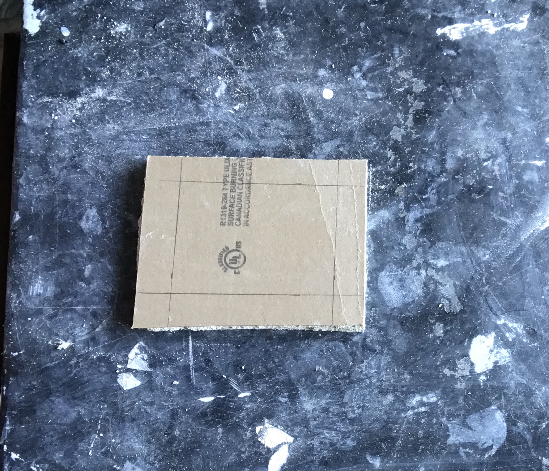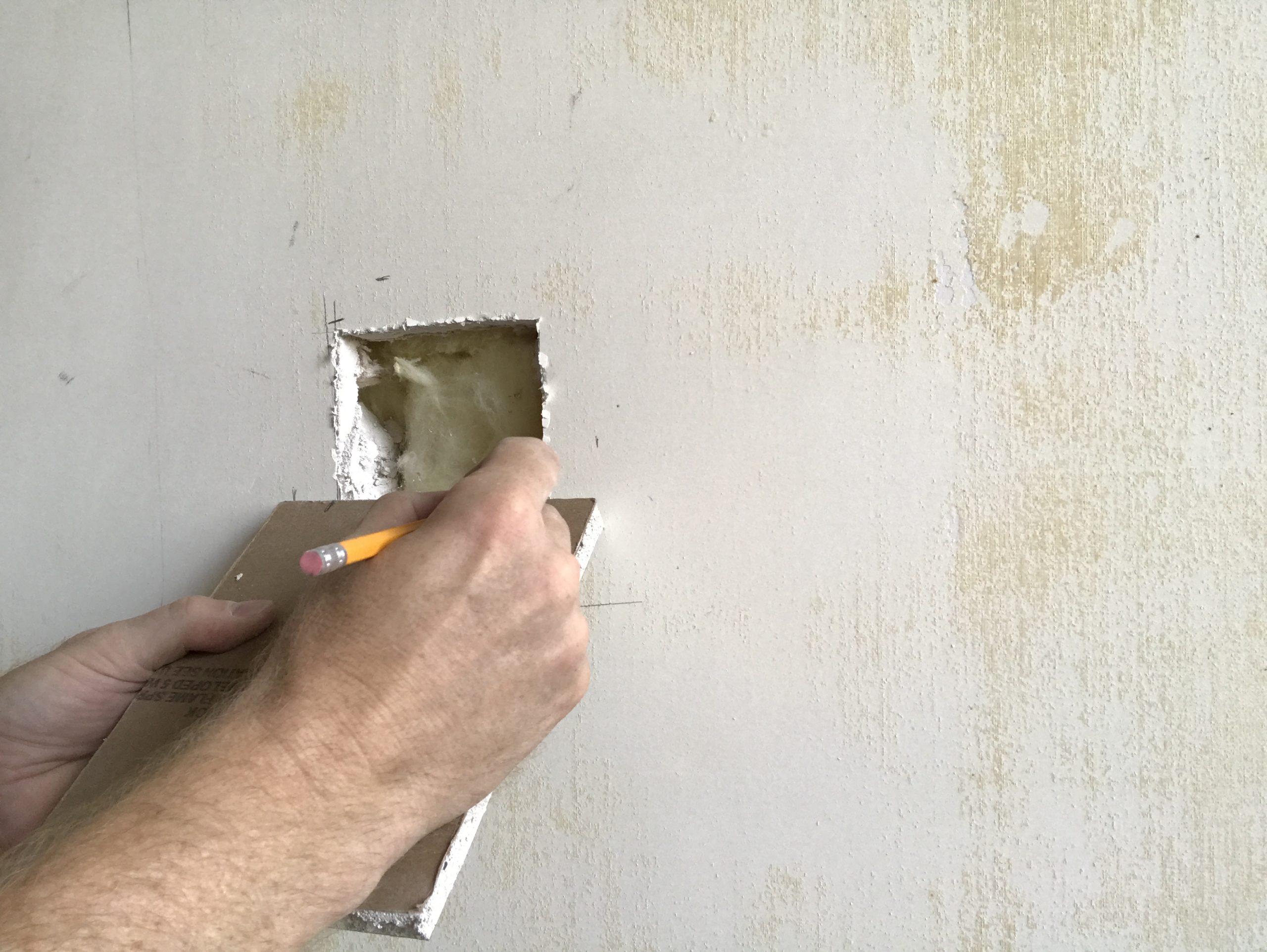 Step 2: Cut a scrap piece of drywall about 2” bigger in each direction. You want a 1”- 2” overlap all the way around. It’ll make sense in a minute, I promise. This doesn’t need to be accurate either, but for display reasons, I measured mine out.
