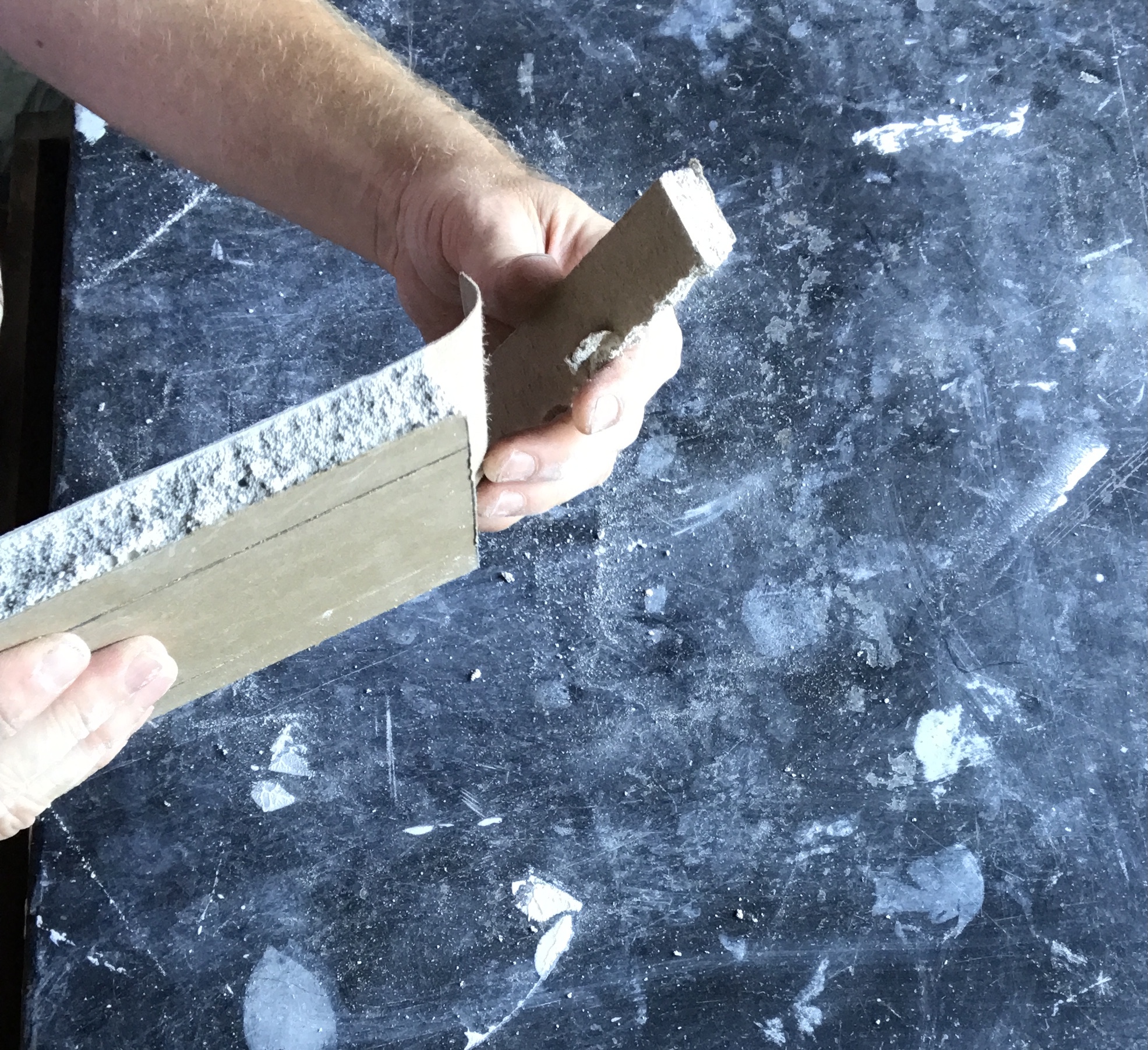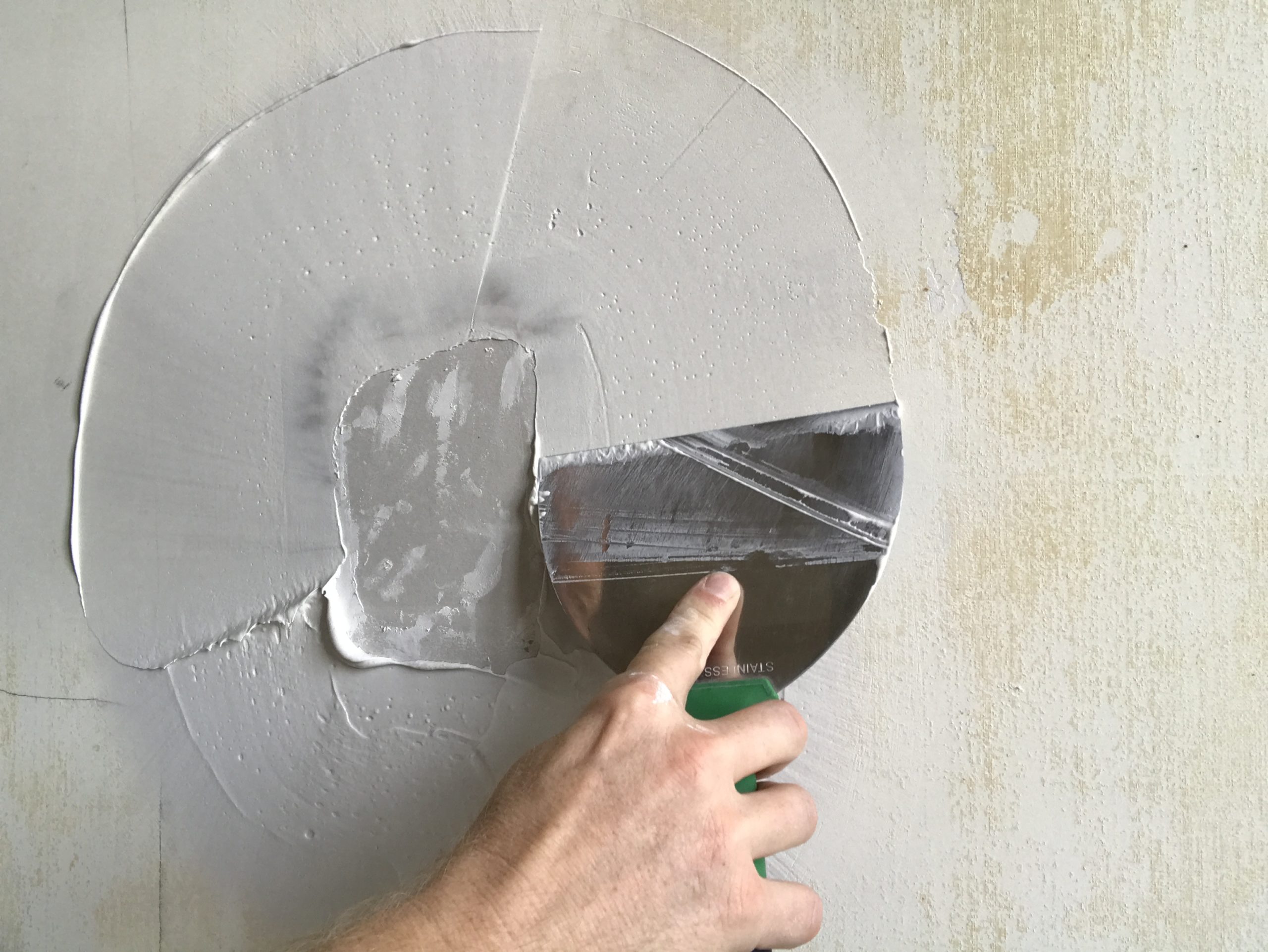 Now smooth out the mud. Put a little more pressure on the outside of the knife. There should be a slight “incline” from the existing wall to the center of the California patch.