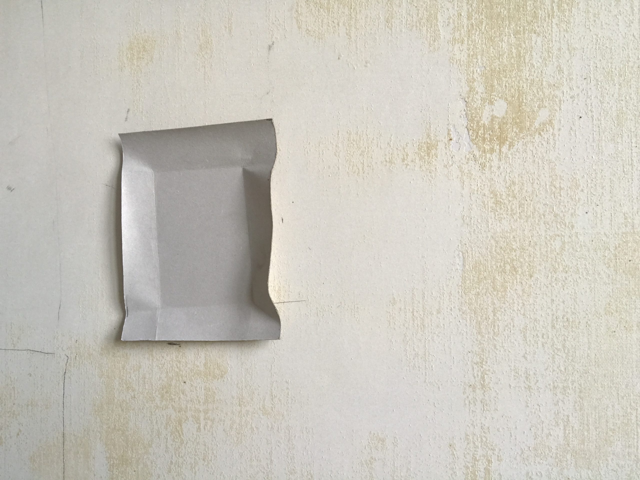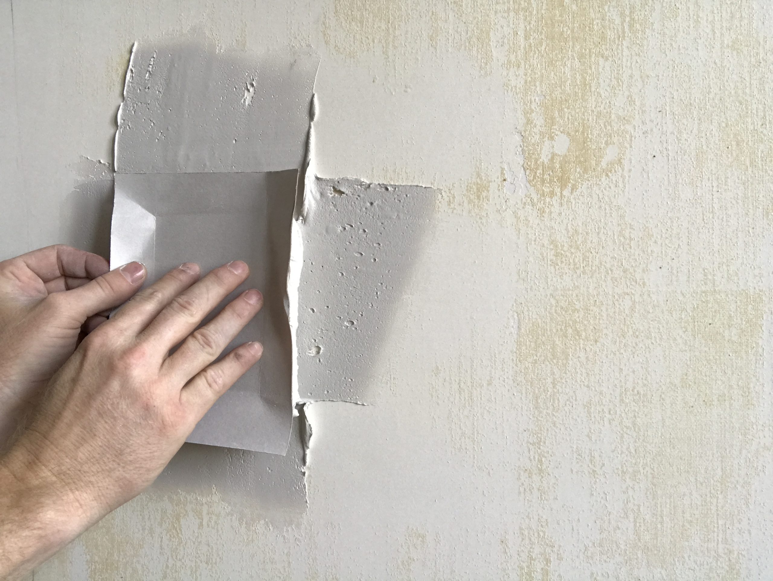 Step 11: You should be left with a drywall plug surrounded by loose paper. Clean off any residual gypsum on the paper. You’ll need this to lay flat on the wall and any crumbs will make that impossible.