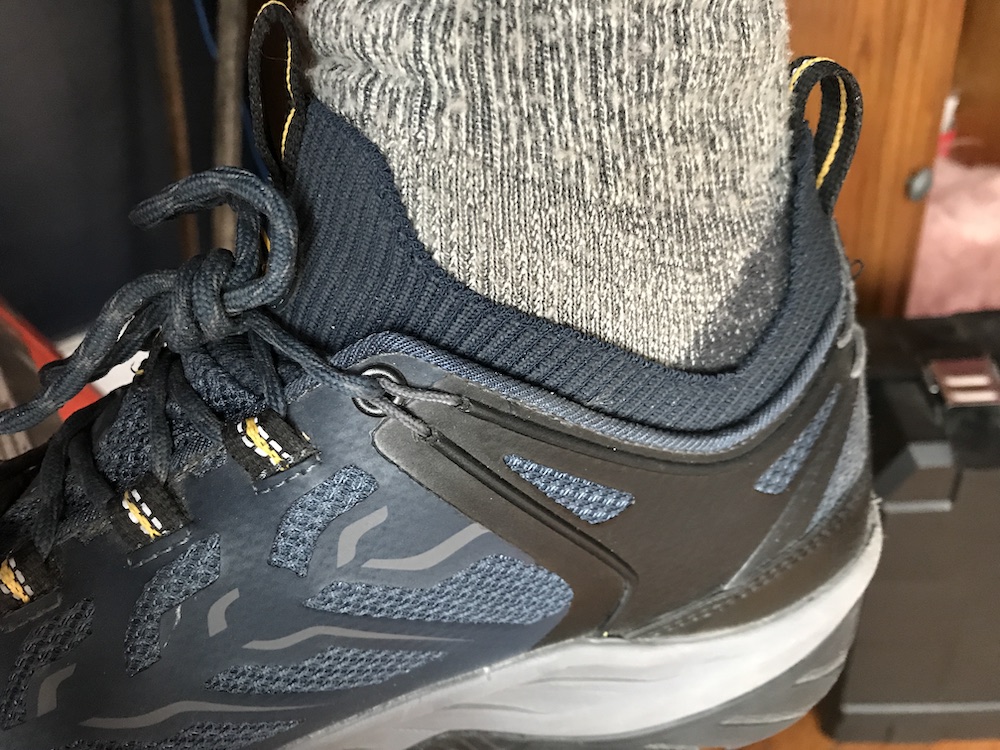 Once your foot is in, and the laces are snugged up, that elastic shroud forms a barrier that helps keep out the nuisances of the real world. Nuisances like sawdust, metal shavings, chunks of plaster during demo, dirt and gravel. It also extends around the front, where the tongue would normally be, and provides a nice, smooth surface over the top of your foot.
