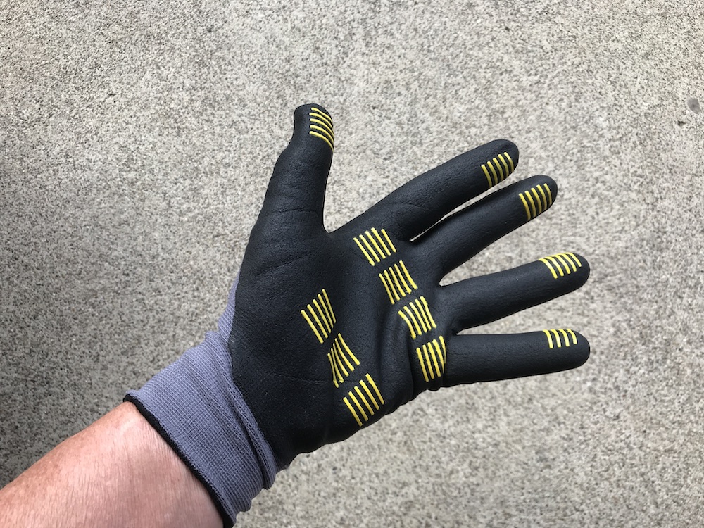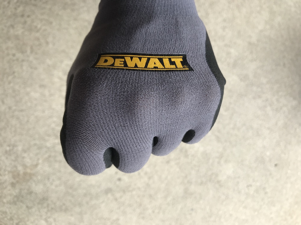 DeWalt Tread Grip gloves, product # DPG76, are available in size L and XL; I got the size XL, and although they were snug (for something completely different!), the material is so stretchy that they actually weren’t a bad fit. I was able to fully flex my fist, something that’s difficult or impossible with many gloves.