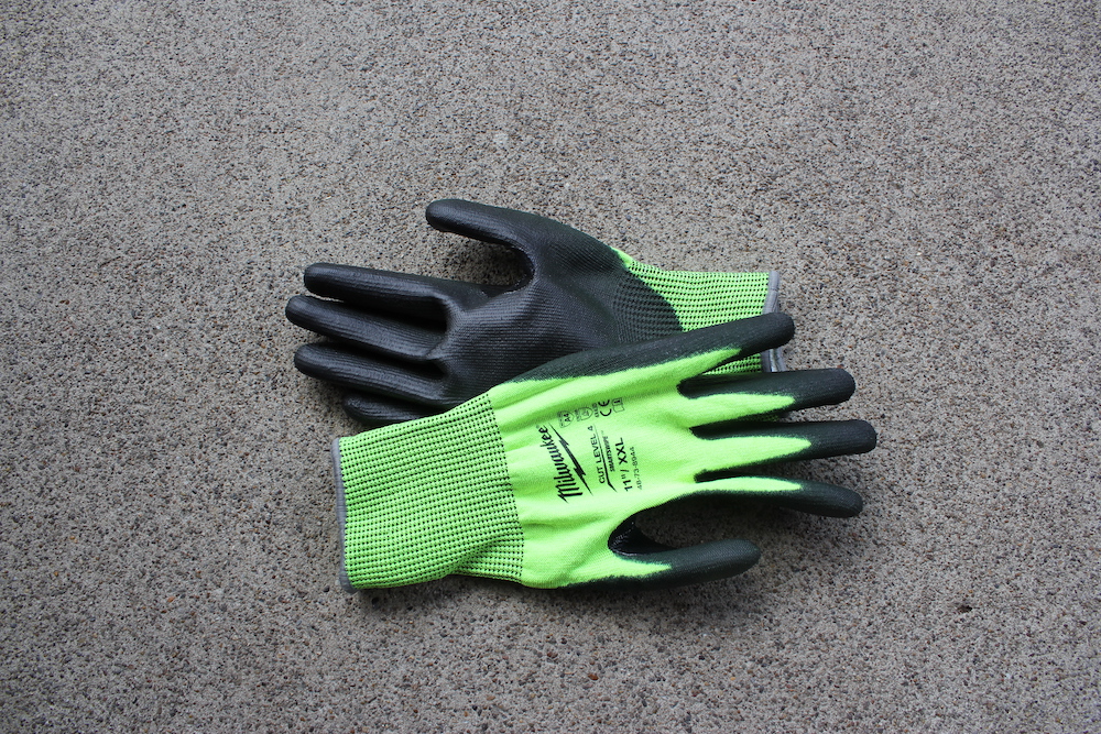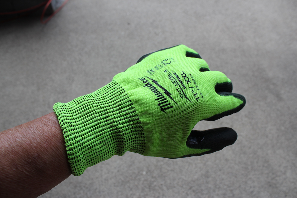 And on to the green gloves, which definitely have a place in the essential PPE lineup. Anyone who works with sharp tools, or comes in contact with jagged edges, broken glass, etc. is probably familiar with cut-protection gloves. The hi-vis Milwaukee gloves we got are nitrile-dipped gloves, with high-performance polyethylene woven into the gloves, to provide level 4 cut protection.