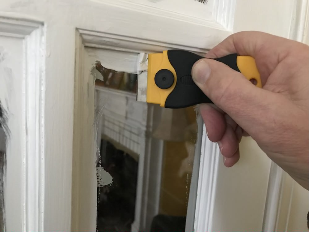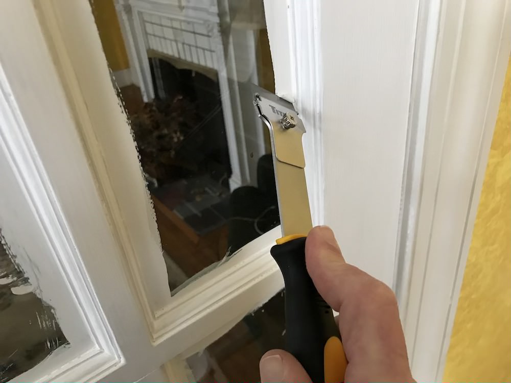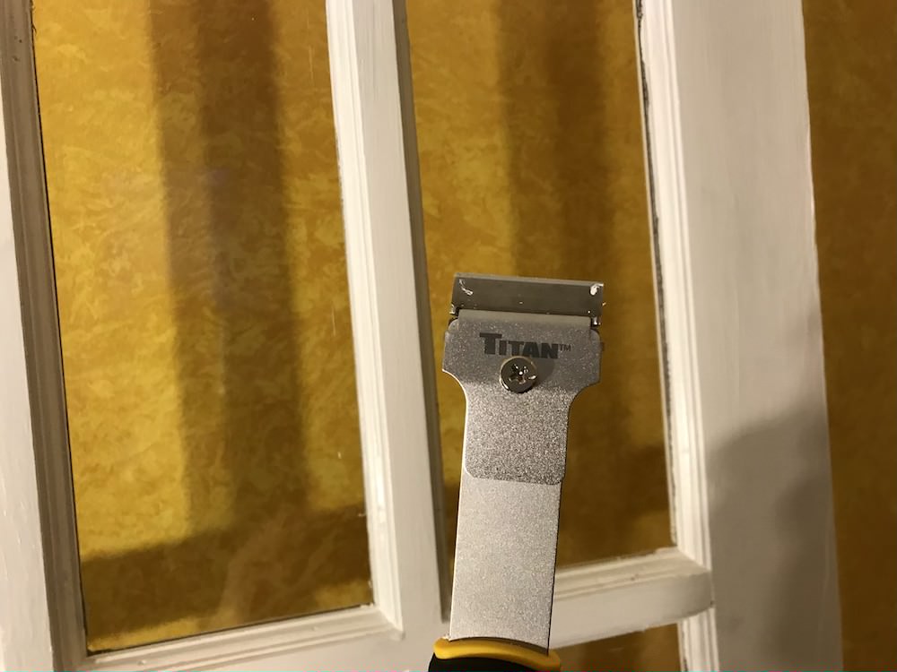 Recently, the task “Paint the French doors at this end of the living room to match the French doors at THAT end of the living room” floated to the top of the honey-do list. For some reason, the French are fond of inserting numerous panes of glass in their doors. This may make them more pleasing to look at, but it sure makes them a PITA to paint. Choice A: Mask off 36 panes of glass. Choice B: Dive right in and get painting, and tidy up afterwards with a razor scraper. After spending several seconds pondering these options, I stuck the tape back in the drawer, ordered a set of Titan Tools razor scrapers, and started painting.