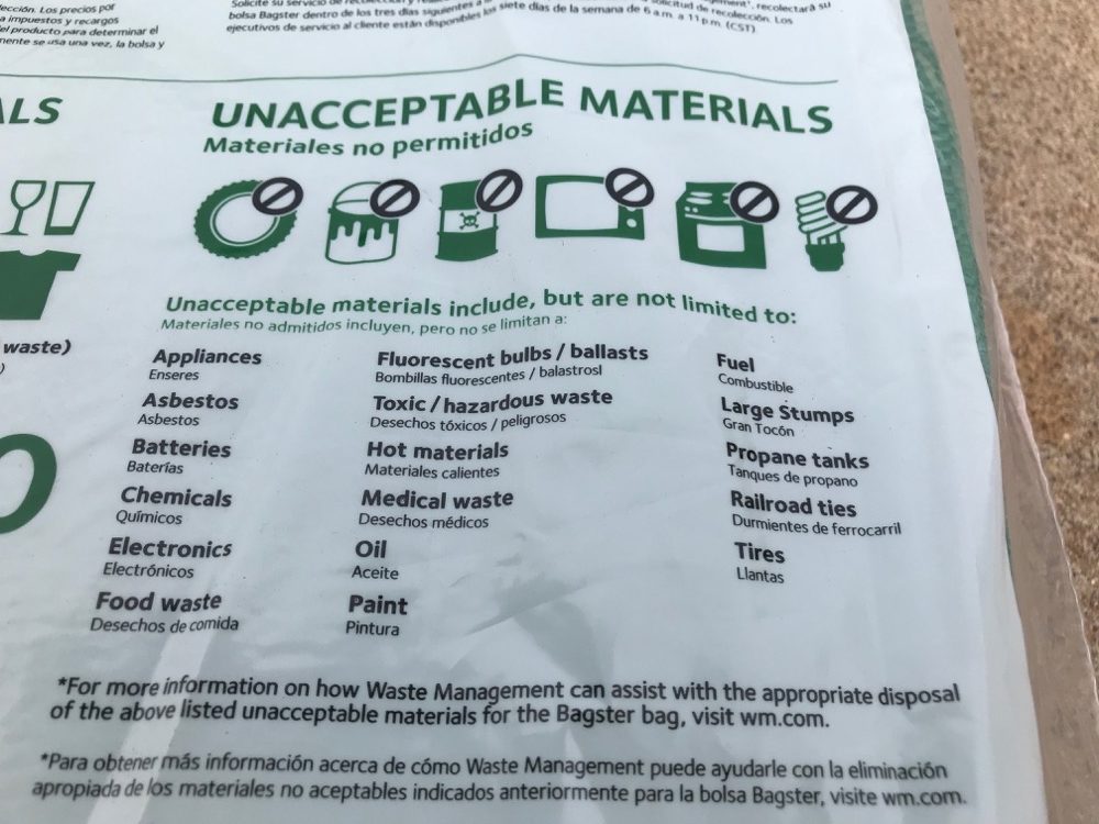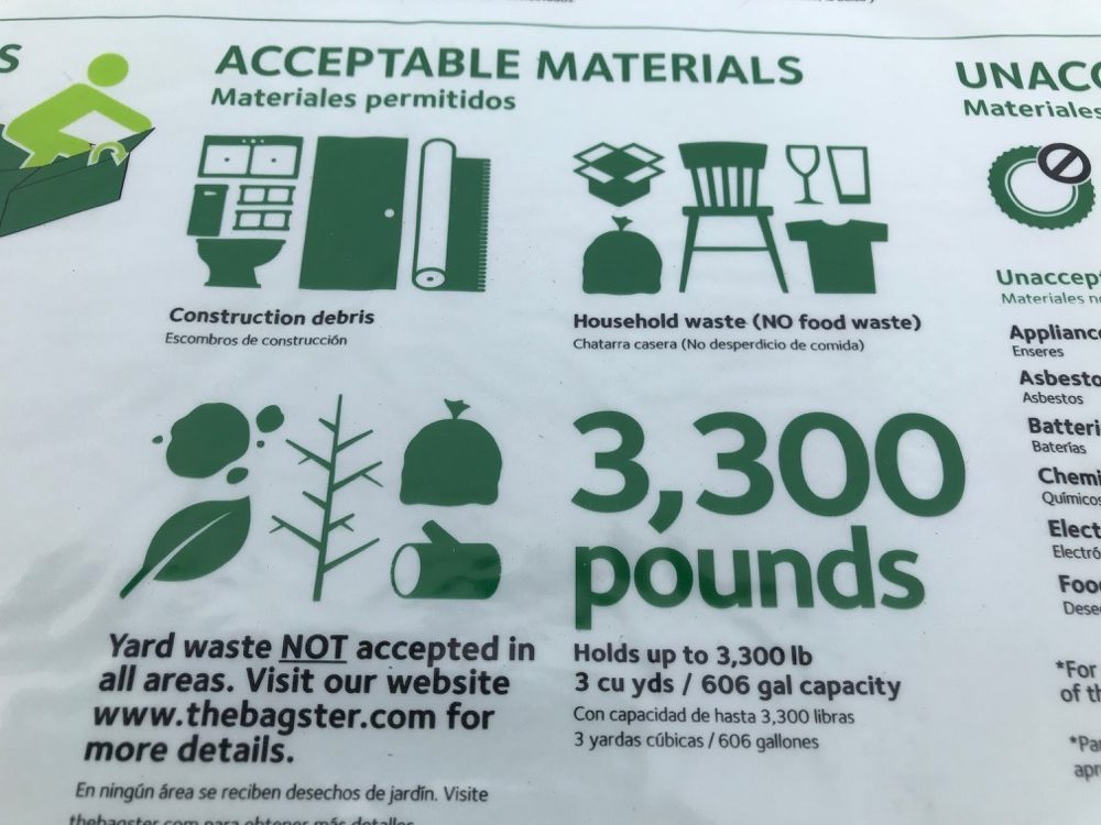 According to Bagster, heavy stuff like asphalt, brick, concrete, dirt, rock, sand, sod and stucco) are all A-OK as long as you don’t put in more than one cubic yard or exceed weight limits. Household waste (no food, it’s not a garbage disposal) and construction debris are acceptable as well.
