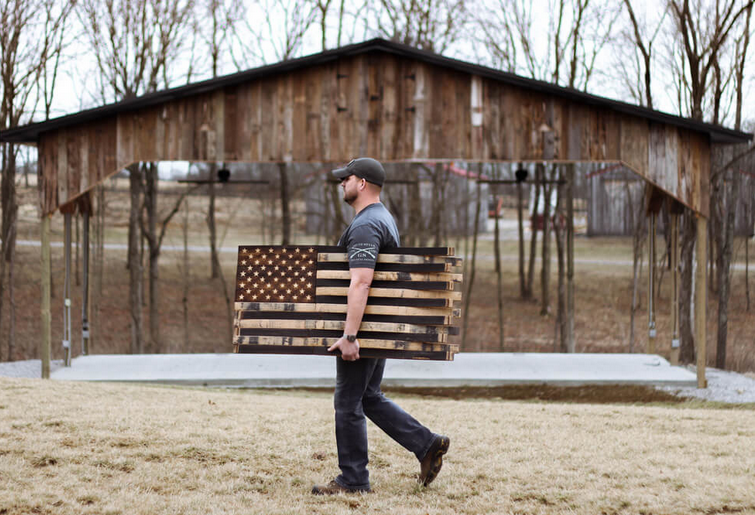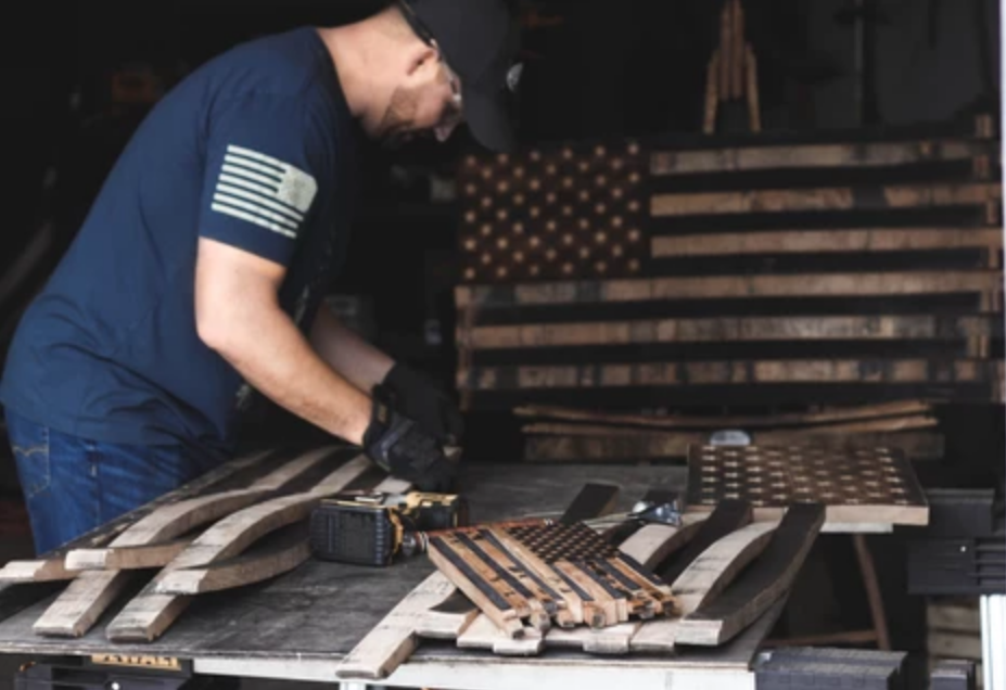 Although using bourbon barrels might seem like a logical move, since there’s a steady supply available from Kentucky distilleries, Chris also has a deeper motive. “There’s a unique metaphor of re-purposing bourbon barrels. Veterans once served a great purpose serving their country, and bourbon barrels once served a great purpose holding bourbon, and we want to help veterans find their new purpose when they transition out of the military, making American flags for other patriots and veterans.”