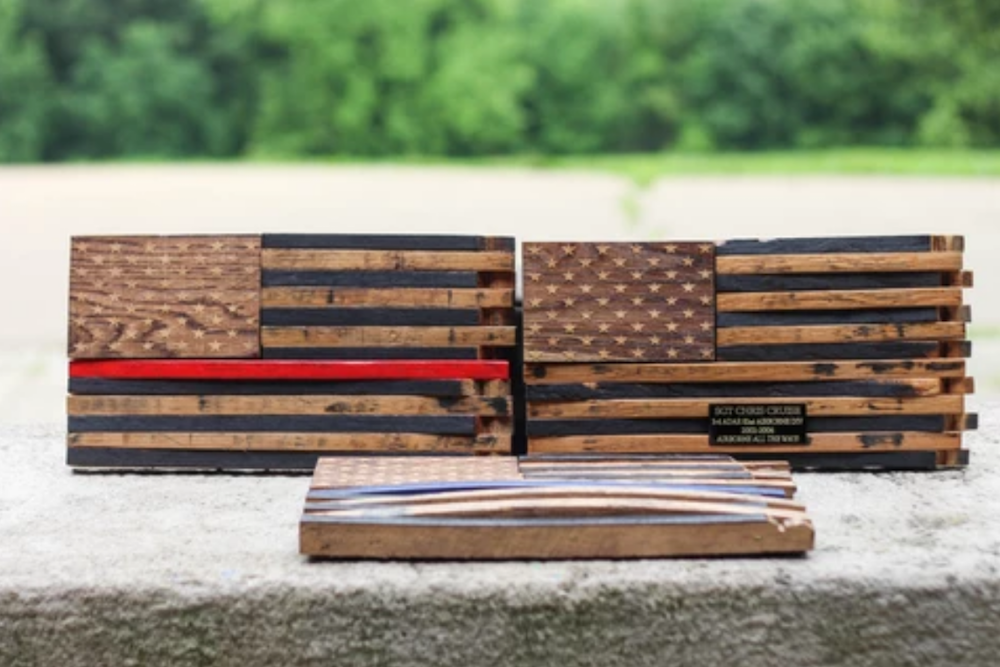 Looking for a truly personal way to customize a flag, for yourself or someone else? The guys at Cruise Customs have the technology to fully personalize your bourbon barrel flag. Make your flag truly unique by adding the recipient’s name and service information, or a patriotic quote. Their laser etching equipment can even handle custom logos, like unit insignias or corporate logos. The upcharge for adding a custom name or logo is a very reasonable thirty bucks.